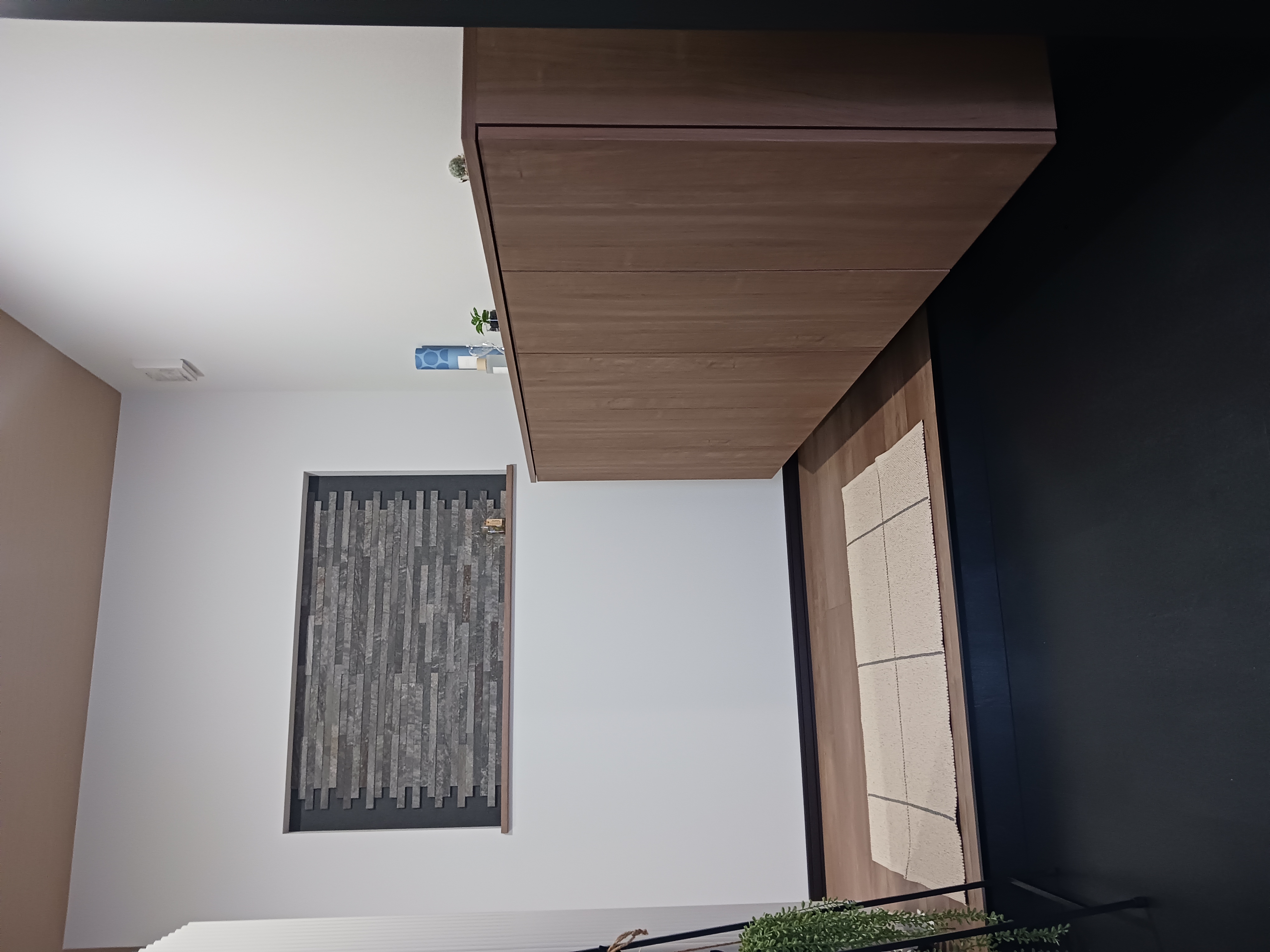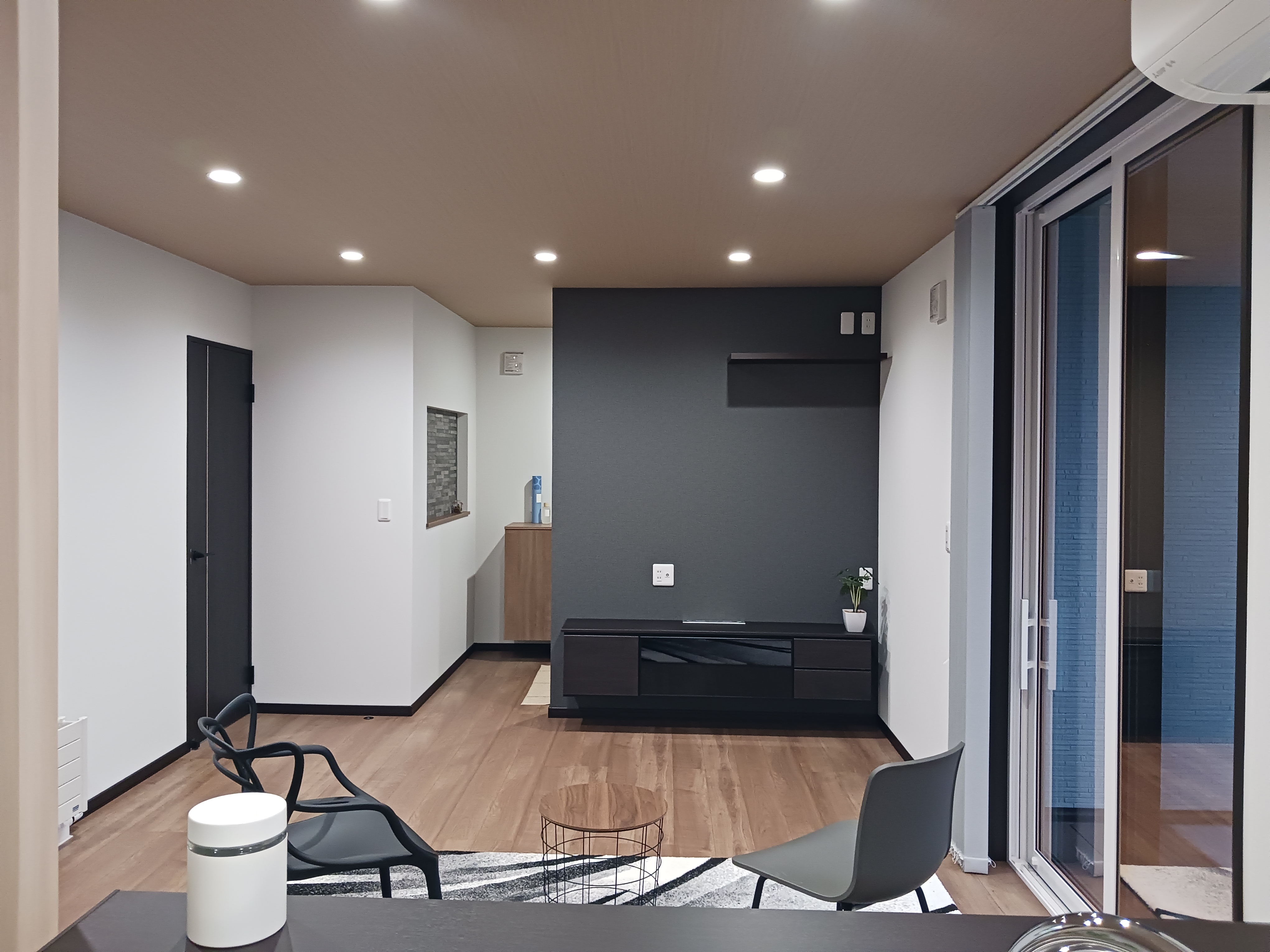白を基調としたクロスとやわらかな印象の床と天井に、グレーのアクセントクロスやブラックの