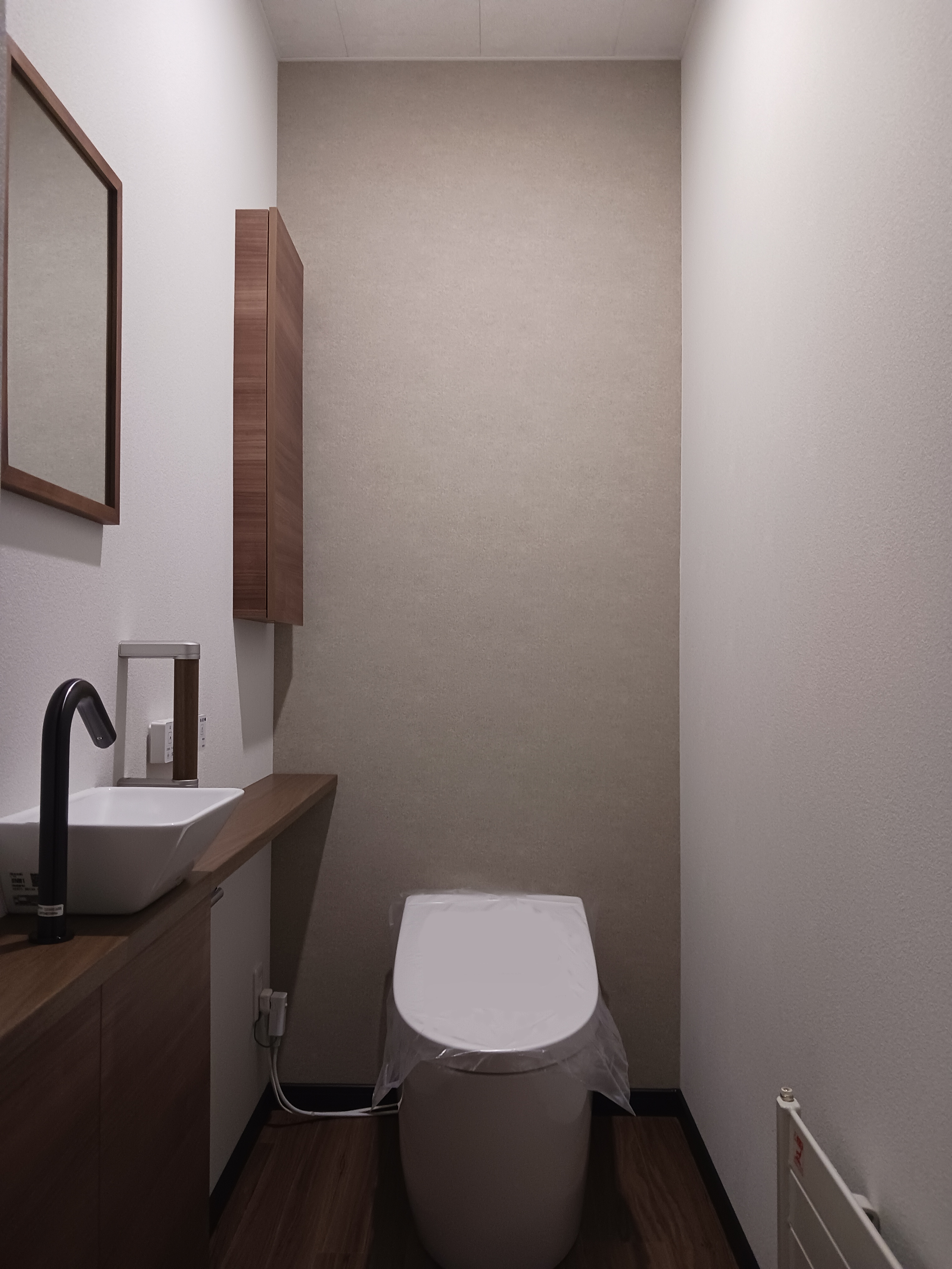 サイドカウンターとベッセル型の手洗いが付いたトイレは、埋め込み収納で収納力も確保しつつ、