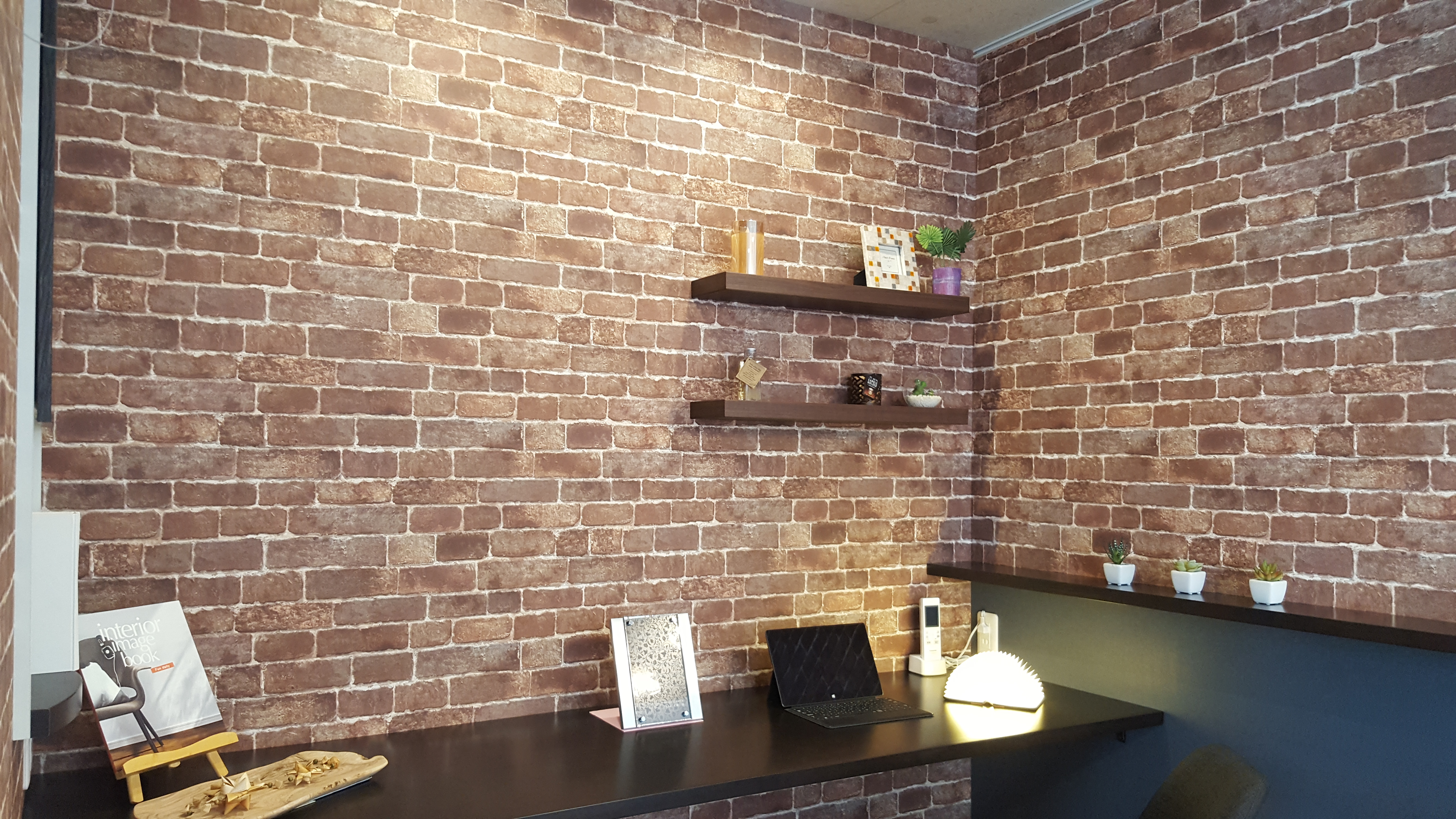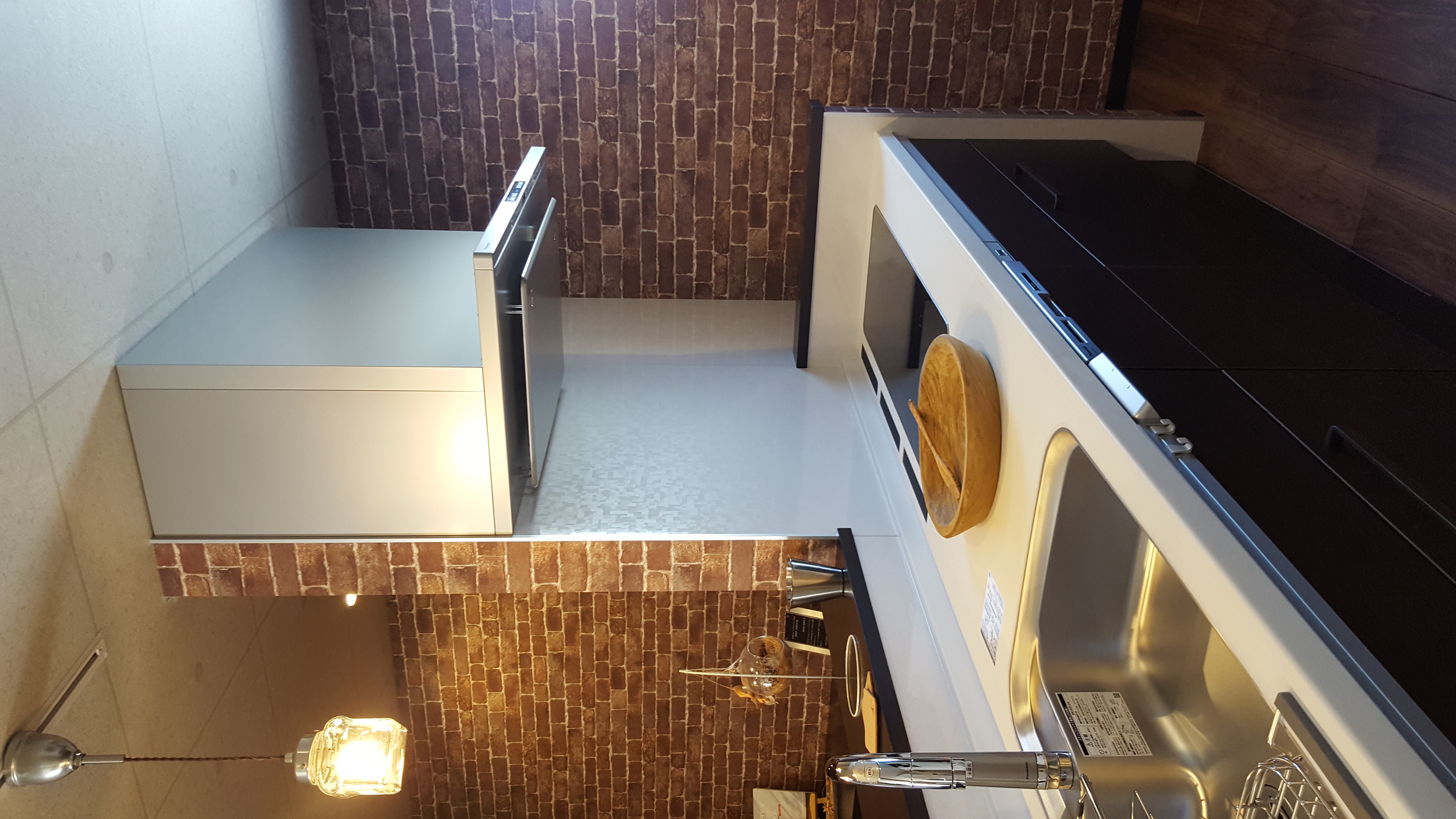 レンガ調のクロスとダークカラーのキッチンがカフェのような雰囲気のダイニング。