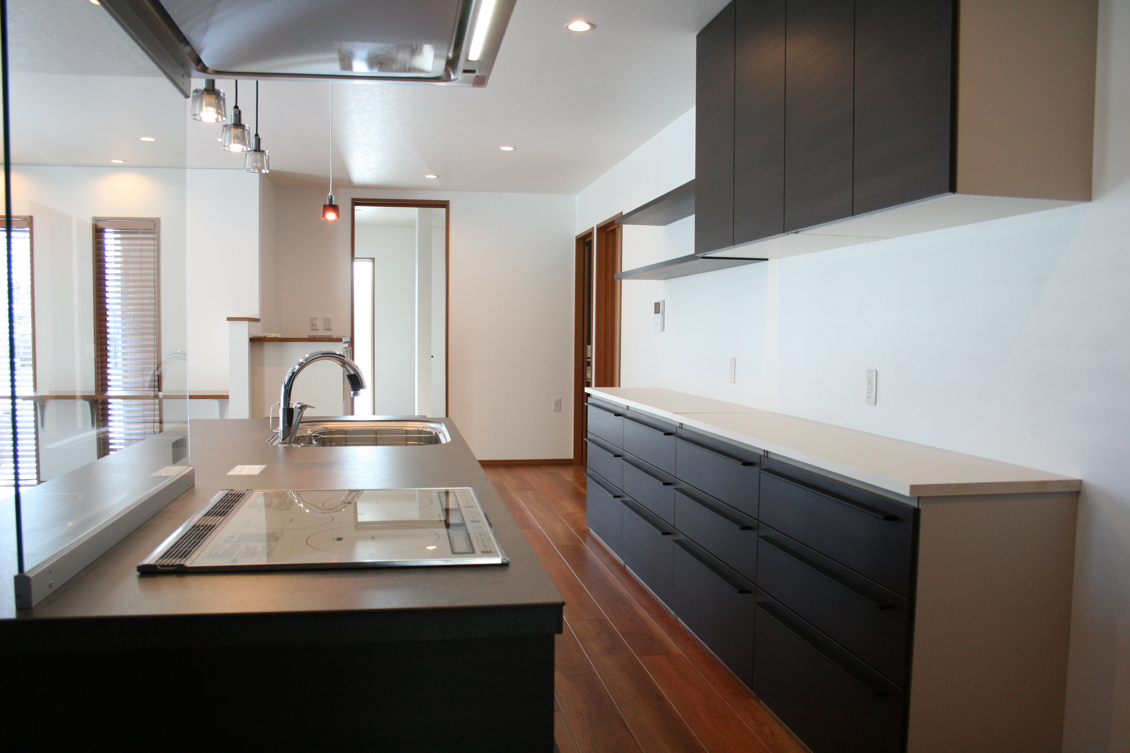 HOME» 新築 »セラミック天板のこだわりキッチンに大容量収納をプラスしたシックモダンな平屋