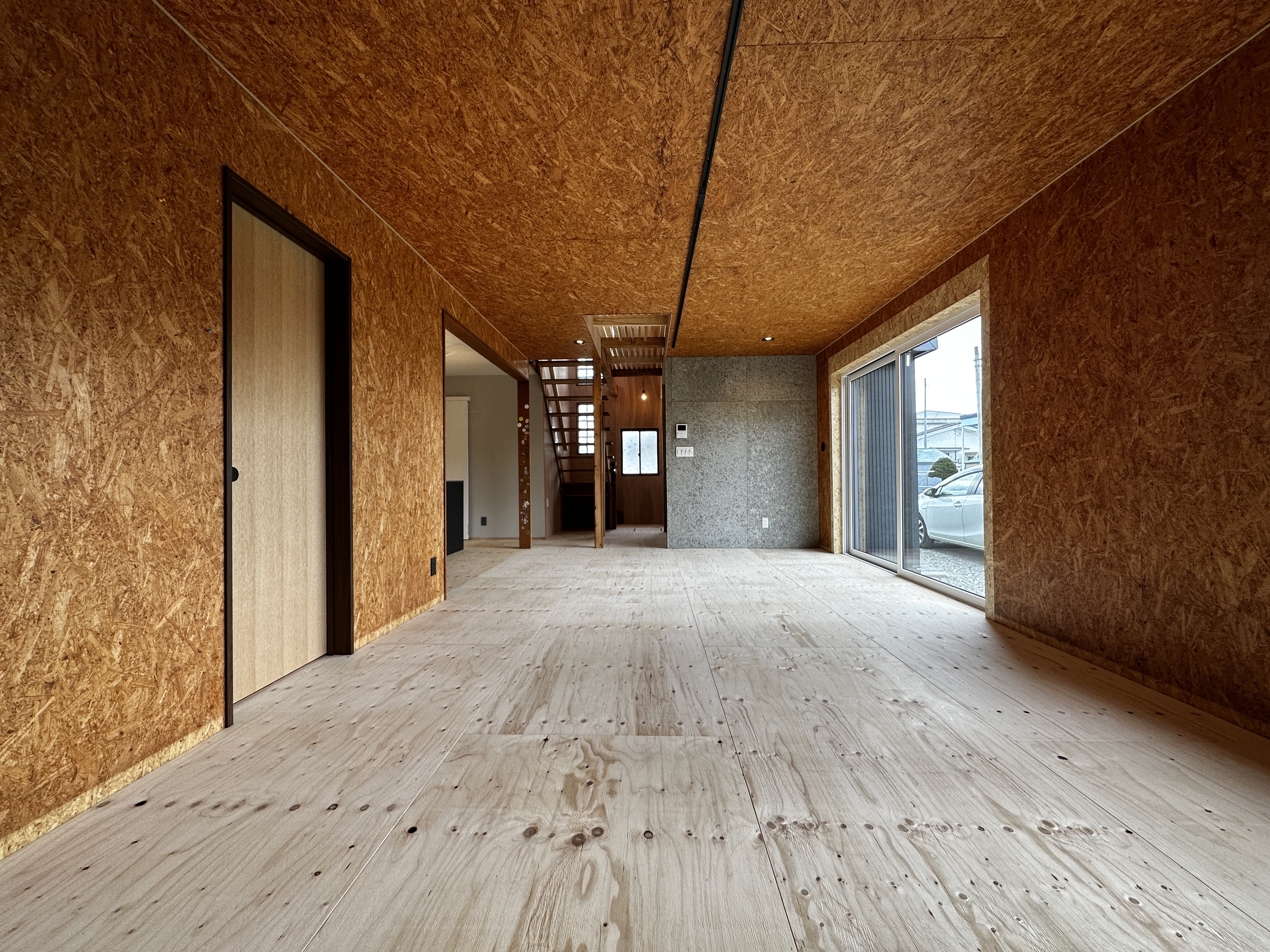 壁と天井にはOSBボード、床には針葉樹合板を使い、素材感を大切にした仕上がりに。グレーの木毛セメント板の壁がリビングの雰囲気をやさしく引き締めています。